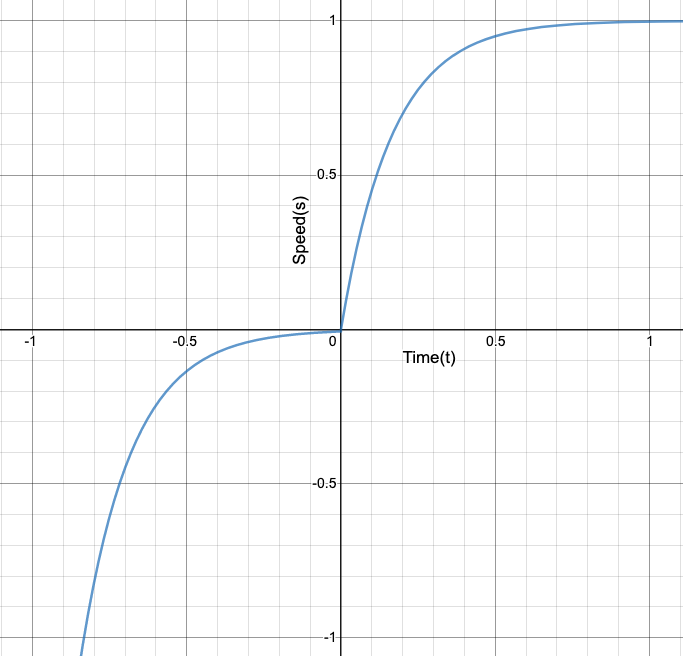 For our sigmoid equation for speed which the robot has to follow, the range of that equation should be from -1 to 1. The normal sigmoid function y = 1/(1 + e^(-x)) has a range of 0 to 1, so with adjustments to meet our need, we can use the equation y = 2 /(1 + e^(-x * A)) - 1, where A is a variable we can change to adjust the acceleration between the values -1 and 1.